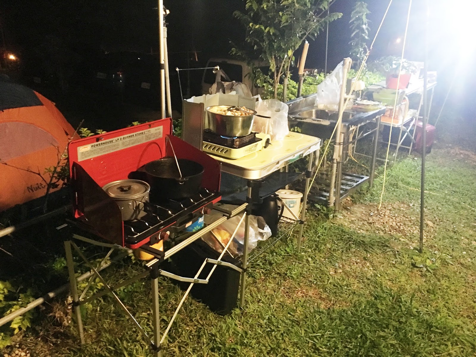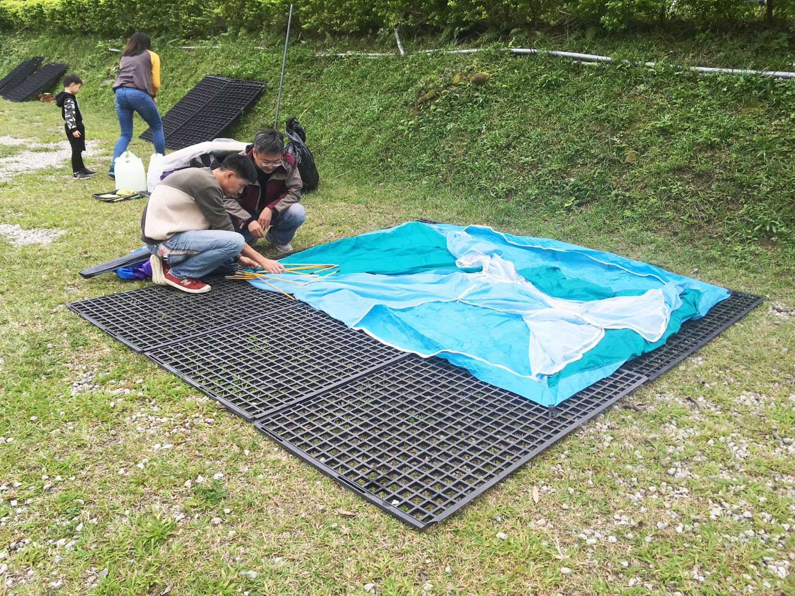 有豐富露營經驗的爸爸、媽媽們,在我們剛搭好自己的帳棚時,一轉眼已經搭好各自的帳棚和客廳帳了,還擺放好桌椅和廚具,讓大家有個舒適的客廳和廚房。