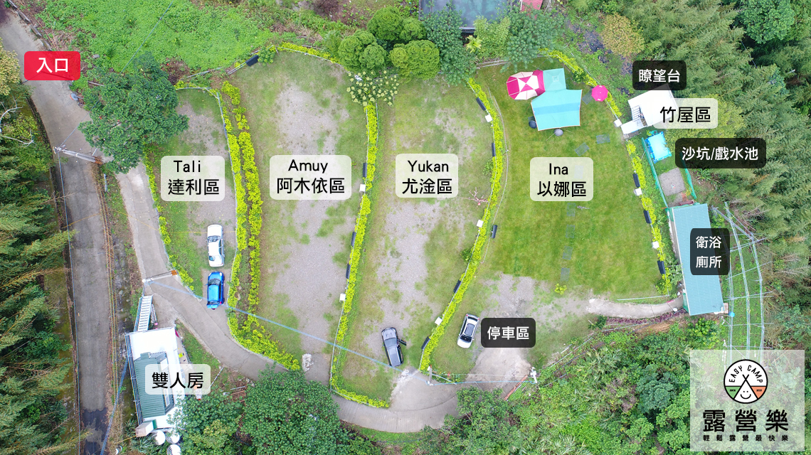 總共有四個營區,共17帳,每一個營區名稱以營主一家的泰雅族名和媳婦命名,包括:可容納1帳的「Tali達利區」、可容納4帳的「Amuy阿木依區」、可容納5帳的「Yukan尤淦區」、可容納7帳的「Ina以娜區」。