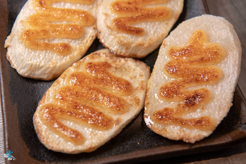 明太子山藥:烤過後的山藥片,感覺就好像有厚度的洋芋片,帶點酥脆的口感,黏度也稍減,明太子讓滋味更加細膩順口。