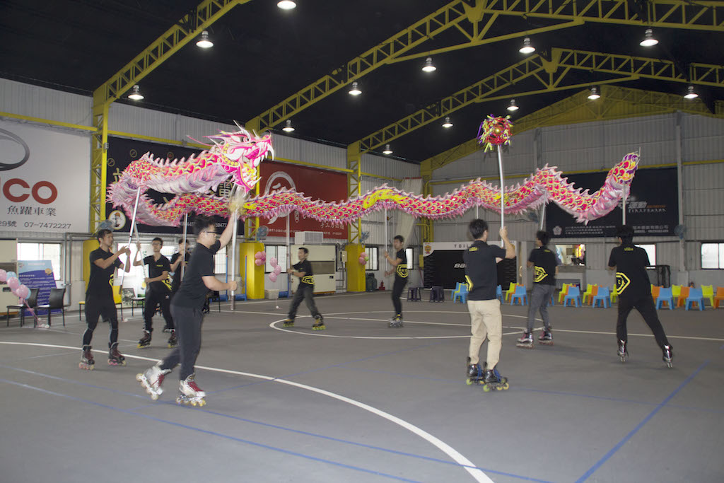 歐教練甚至整合了溜冰和民俗技藝,發展出了一套溜冰舞龍法,適合大小朋友運動和表演,活靈活現的舞龍經常受邀至公家機關、企業、學校...等單位表演,也讓苦練有成的孩子們很有成就感。