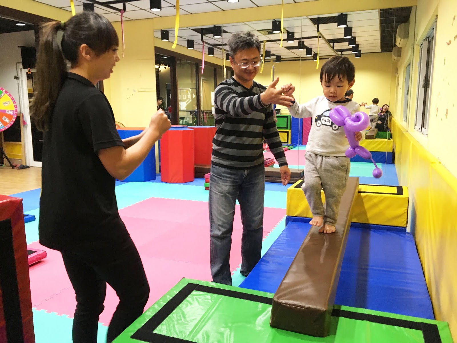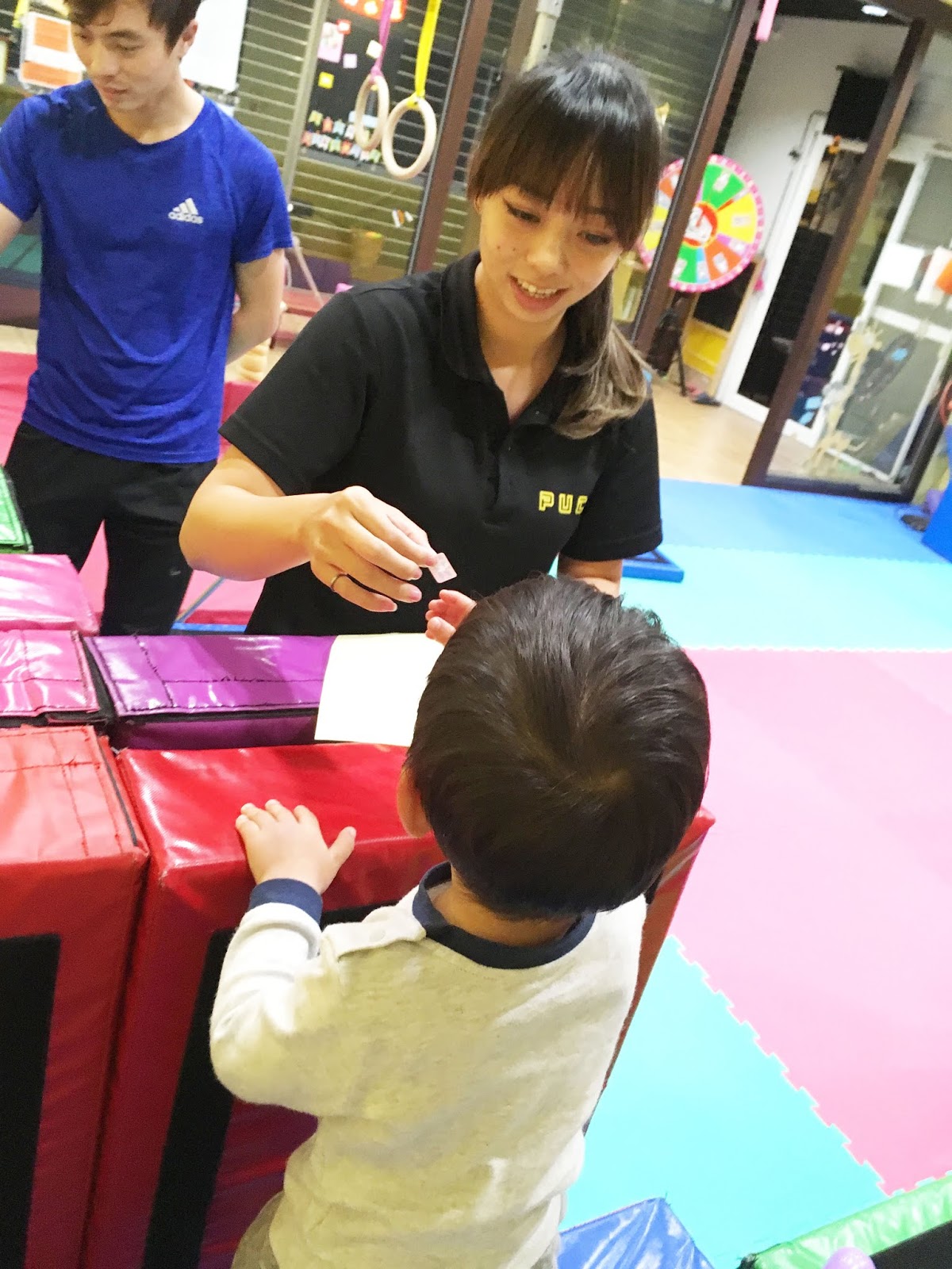 幼兒體操適合1y10m以上到6歲的孩子,考量到幼兒一般和媽媽比較親近,特地安排女教練授課,給孩子安全的依附感。剛到陌生環境通常都會有點怕生的小福寶,在美麗的女教練溫柔地循循善誘下,馬上就配合走平衡木、跨越三角錐和雙腳跳墊子,小福寶拿到教練獎勵的貼紙超開心,讓我們很佩服教練的教學專業。