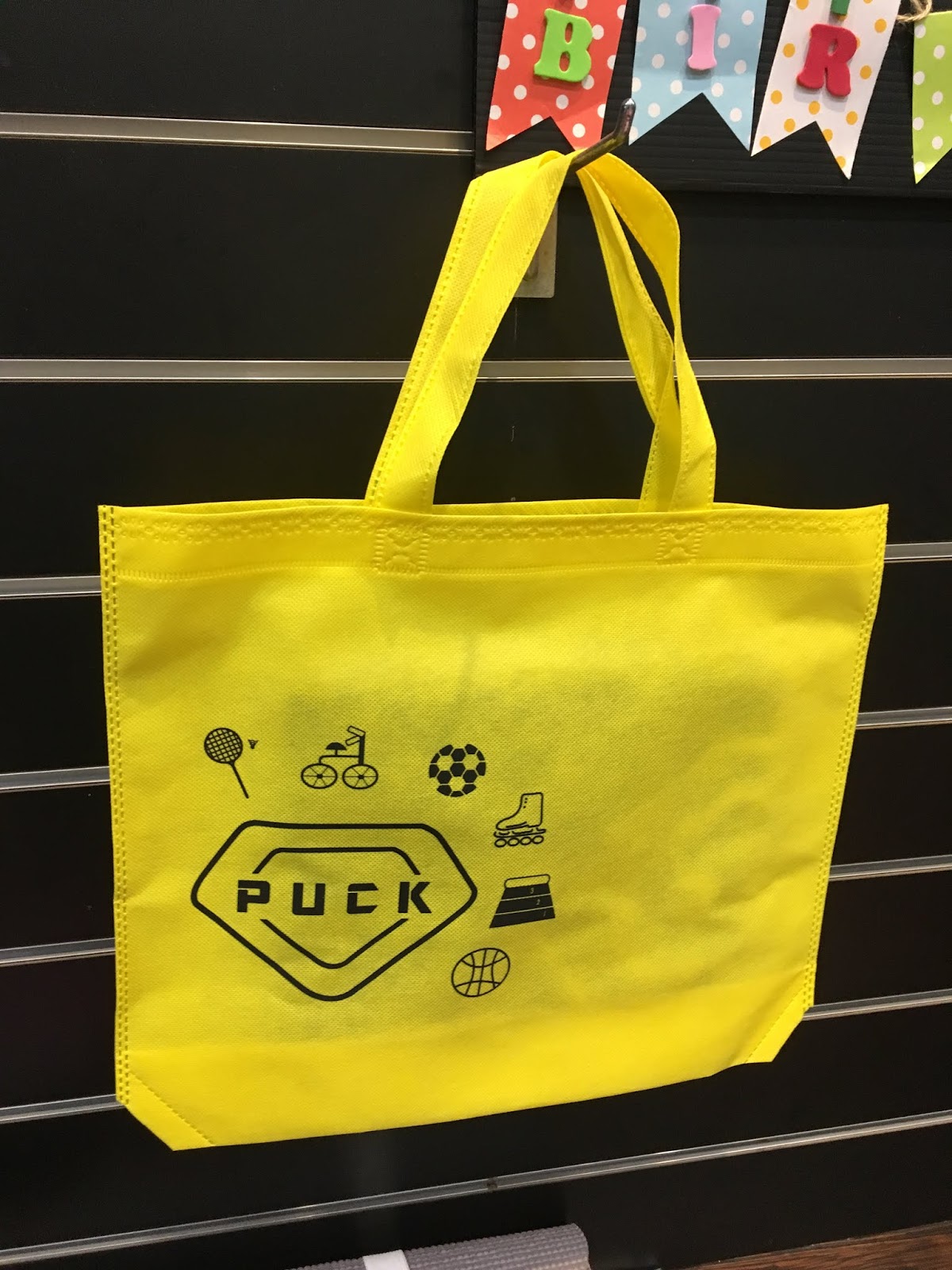 離去前,我們注意到櫃檯許多小物上都有「PUCK」和「帕克運動學園」的標記,歐教練給我們看他們獨有的周邊紀念品:有束口收納包、毛巾、水壺、購物袋...只要是學員幾乎都會有一套,和國家選手使用一樣的物品,在運動時感覺特別有型。