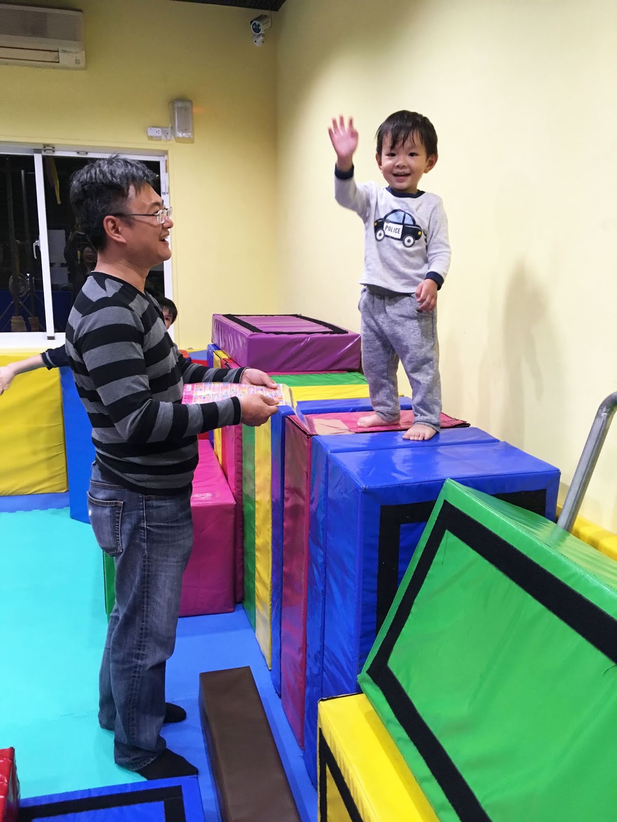 小福寶或許是被這群運動健將的熱情感染,感覺也很想動一動,自己跟著跳上跳下,爬到高高的軟墊上,跟大家揮手致意。熱愛運動的教練群,自然能引導孩子沈浸在運動的快樂與成就感裡。