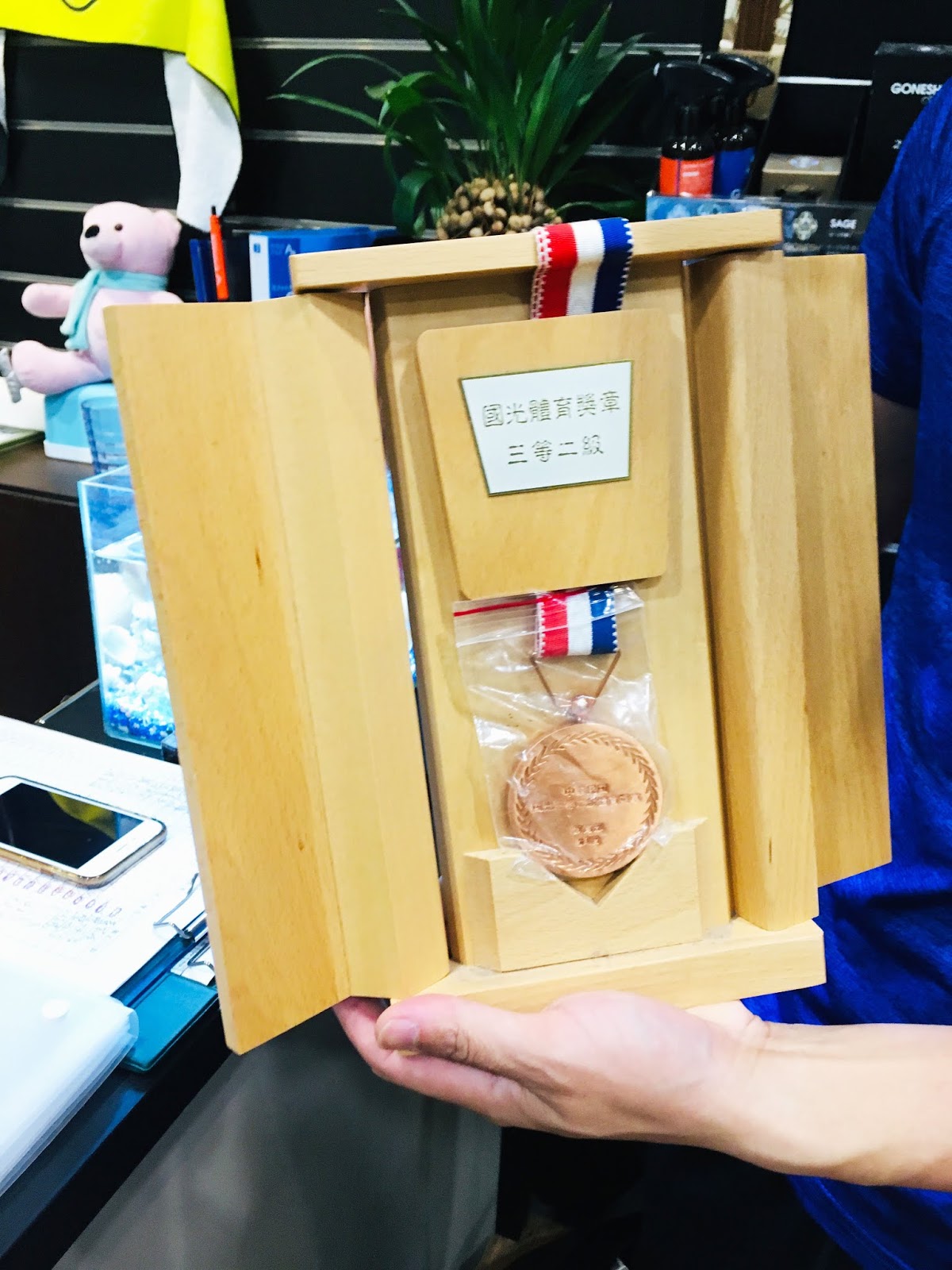 服務人員發現我正在拍照,打趣地要歐教練取出壓箱寶給我拍,歐教練很不好意思地笑笑,拿「國光體育獎章」給我們看,這是政府頒發給國際賽事表現傑出的運動選手的殊榮,歐教練一個人就取得過兩次,真是太厲害了!