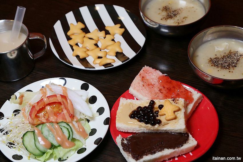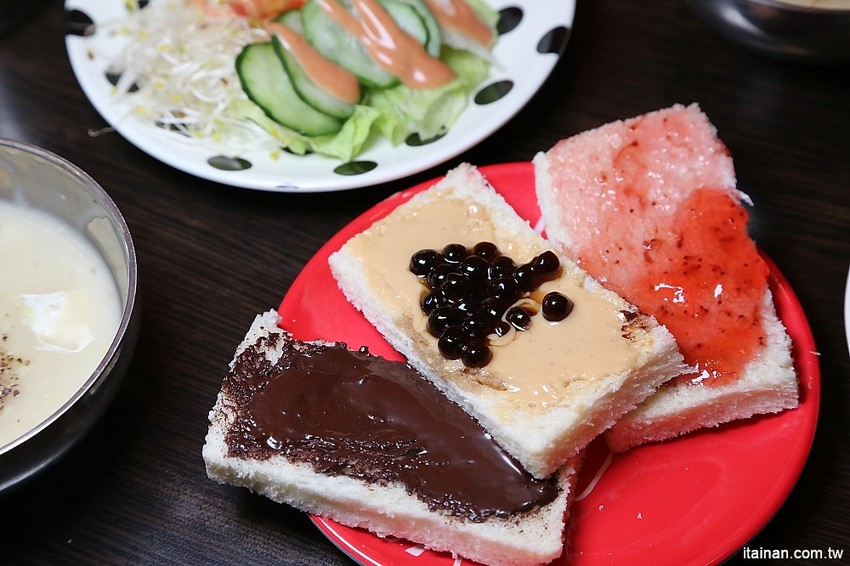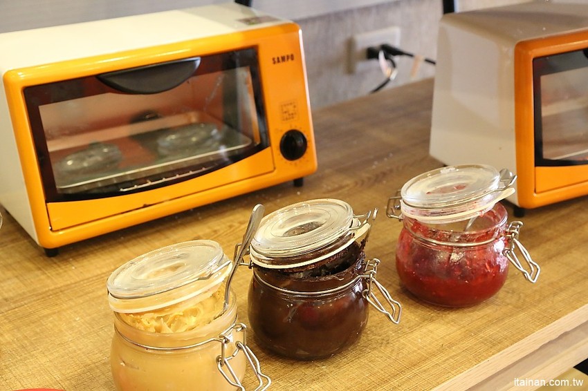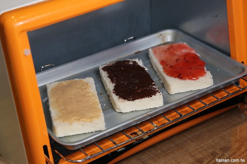 吐司的部分提供三種果醬:巧克力、花生、草莓,可自行Diy,抹完醬稍微烤過就能享用。