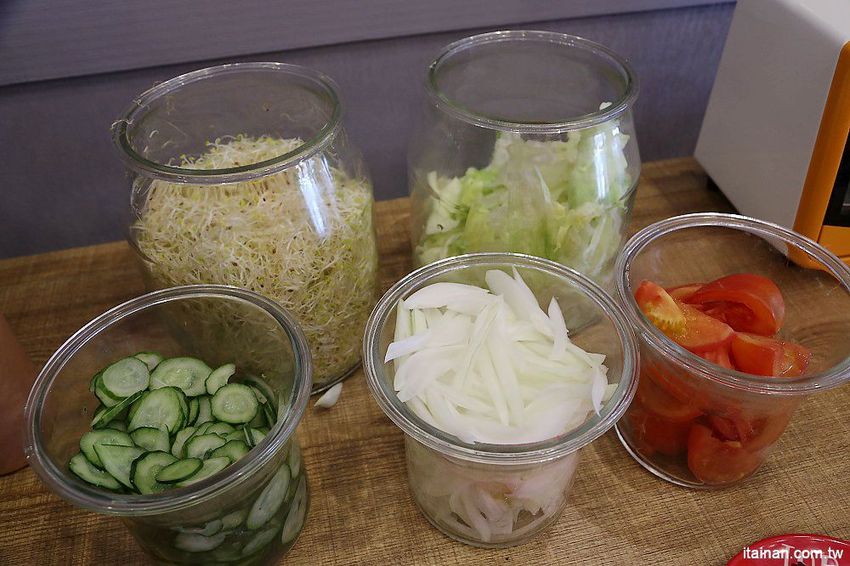 生菜沙拉有生菜、苜蓿芽、小黃瓜…等共5樣食材,店家以小量供應空了就立即補足,以保持食材的新鮮度與賣相。