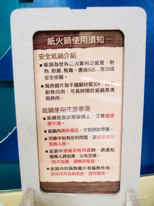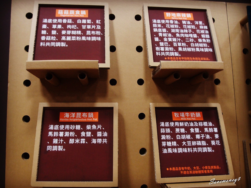 這裡還有紙火鍋四種口味湯底的說明,包括了素食鍋,麻辣鍋,昆布鍋和牛奶鍋