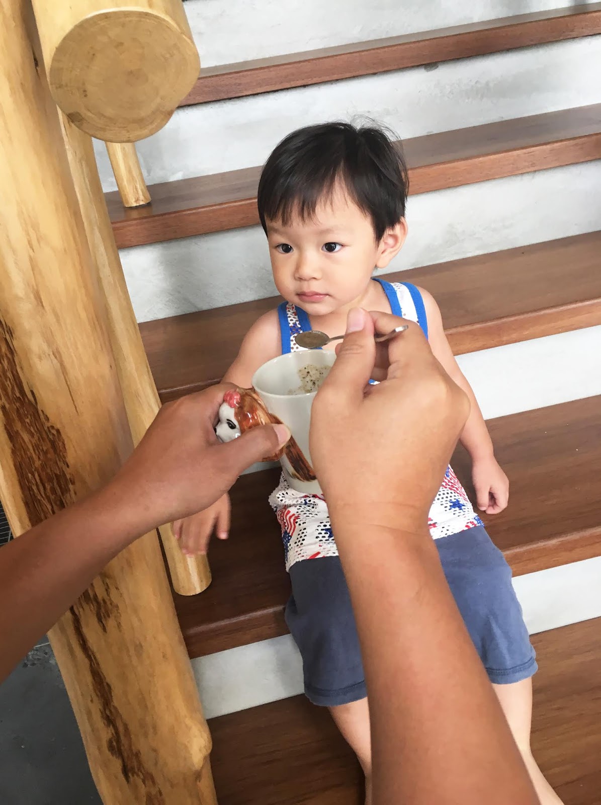 創意無限的小福寶,要求今天要坐在樓梯上吃早餐,還真的坐在上面把早餐吃個精光。