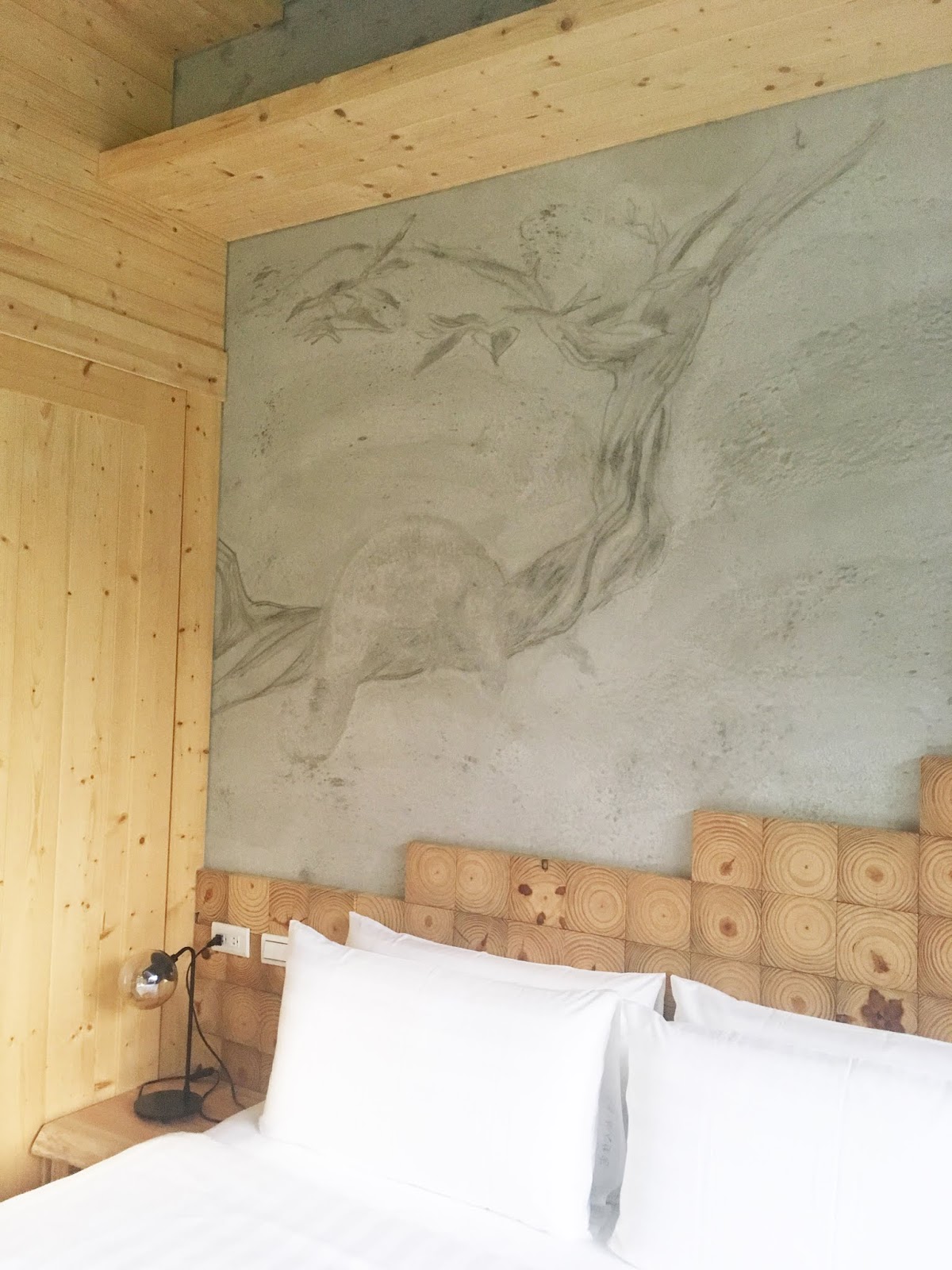 「臥室」有兩張軟硬適中的大床,躺起來很舒服,床頭的牆上是松鼠壁畫,據說是設計師用手在水泥牆上信手捻來塗抹的創作,松鼠的樣子栩栩如生,好厲害呀!民宿主人說每間房間都有動物的壁畫,都是這附近有出沒的小動物,今天正好沒有客人,歡迎我們待會去參觀。