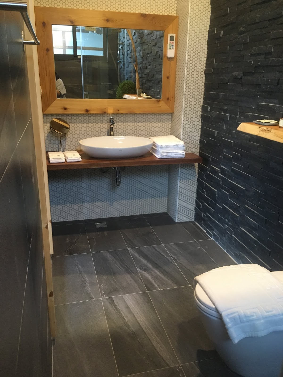衛浴空間也是木質傢俱,看起來很像三溫暖的裝潢,一看牆邊還真的有三溫暖的遙控器耶!邊做三溫暖邊看著窗外的景色好愜意呀。