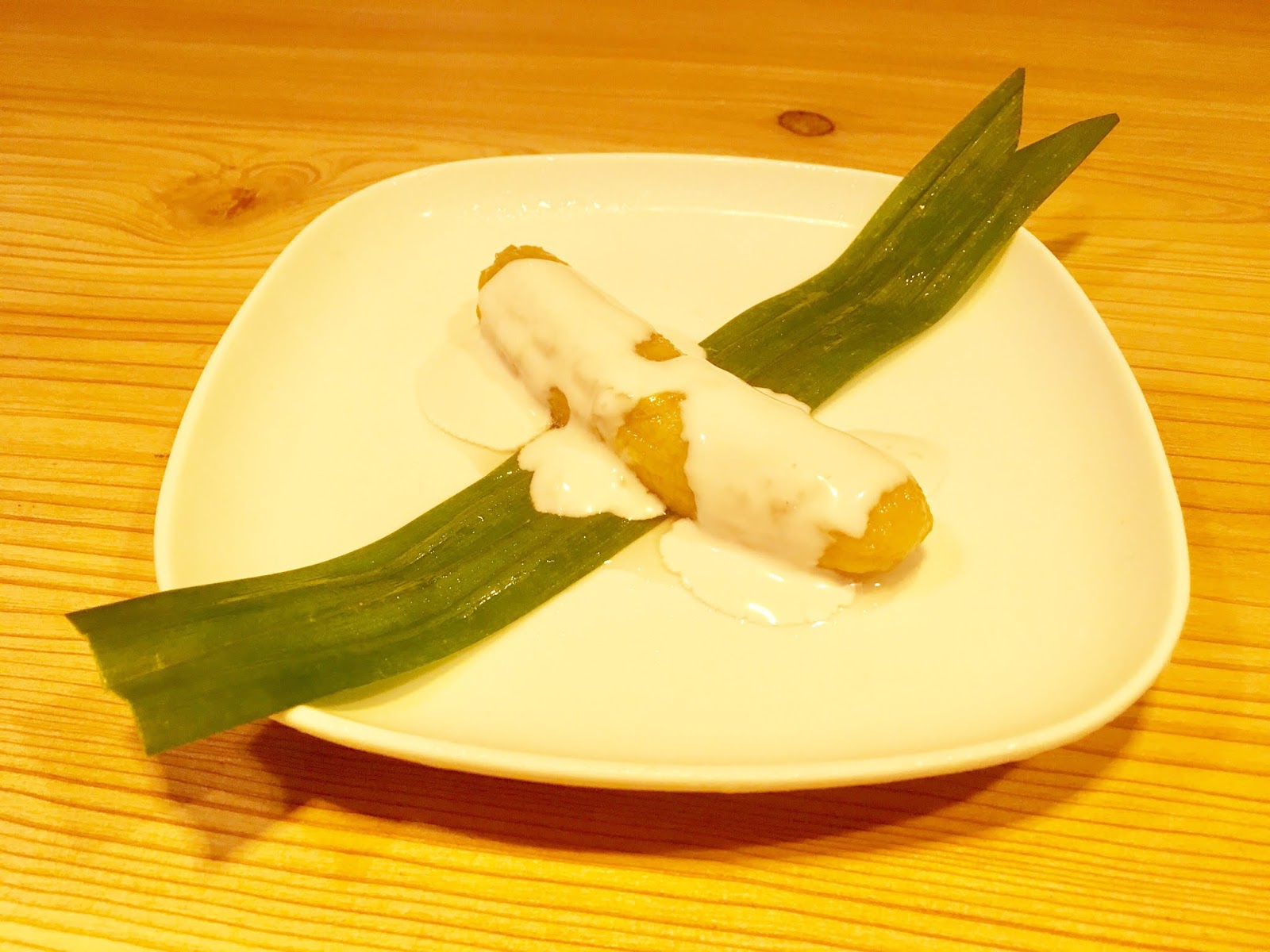 甜點「黃金香蕉」是以椰糖燉煮的綿密香蕉,淋上香濃椰奶,果肉柔軟、香甜味美,小福寶好愛吃這像蜜糖般的香蕉。