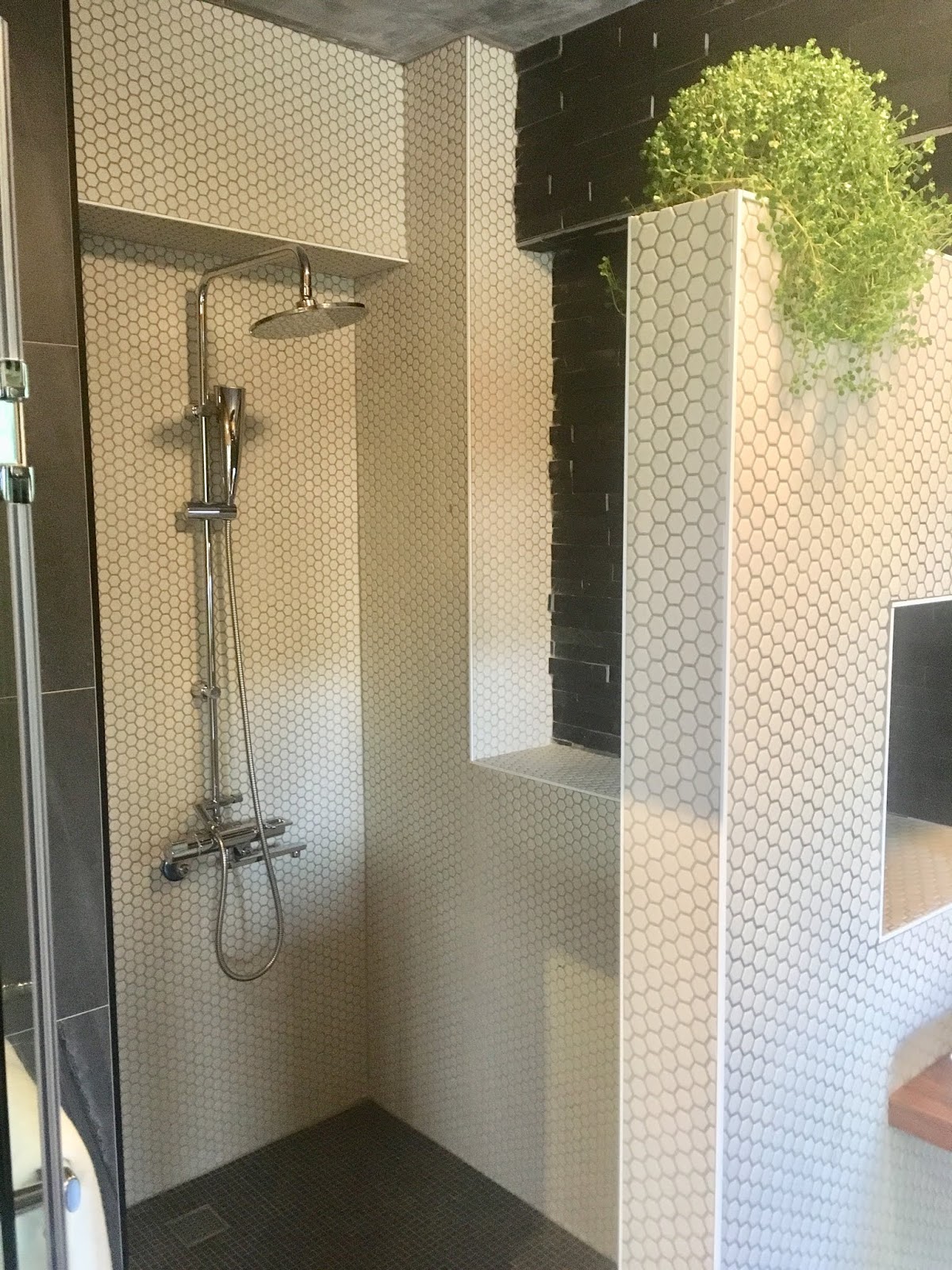 浴室是以玻璃門作為乾濕分離,頂端有大面積的花灑,可以淋浴舒緩疲勞。
