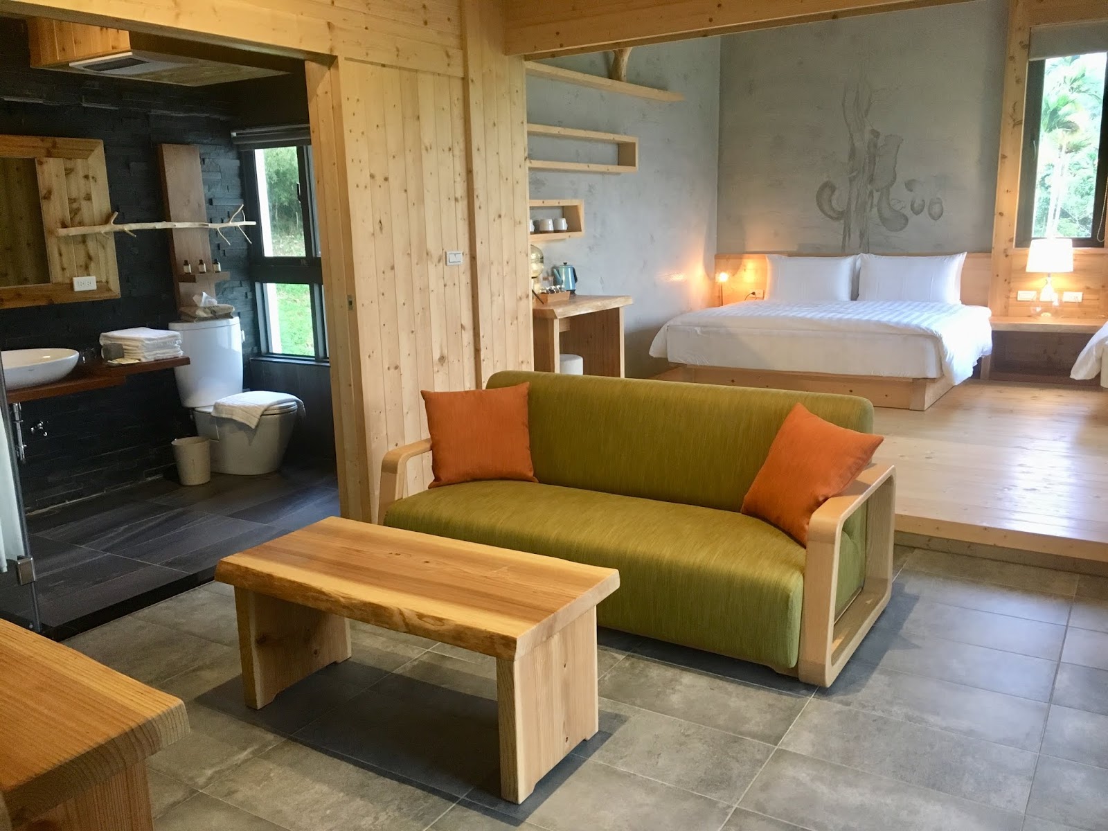 進門後,撲鼻的木頭香氣迎面而來,木質風格使得整體氛圍溫暖沉靜,以自然元素呈現的簡單架構,竟有低調奢華的感覺,民宿主人說整棟建築以松木和杉木為主體裝潢,所以聞到的就是松木和杉木自然的清香。