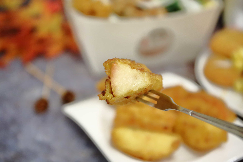 大家沒有看錯,真的是用一整顆的蘋果下去炸的唷