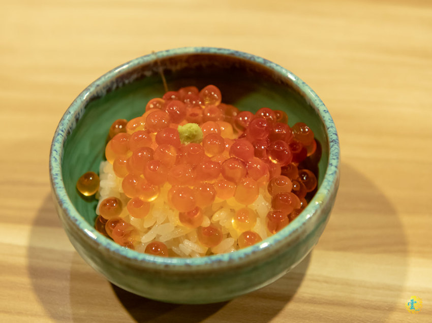 生的鮭魚卵,還帶著『卵巢外膜』而將魚子連結一起內的即是『筋膜』,未經過任何處理的就叫生筋子,也稱腹子。這很考驗主廚的功夫,而每位主廚的料理方式也不盡相同,有的主廚為了口感而去除筋膜,也有主廚為了視覺效果而保留筋膜。筋膜在入口時會直接化掉,口感比鮭魚卵更為鮮甜。在上這道菜之前,老闆有特地詢問了女王已經幾分飽了,女王回答半飽,所以老闆特地在生筋子中在添了一點飯。 一般常見到的料理手法都會以軍艦方式呈現,但是海苔會吸收水分,吃到最後只剩海苔還在咀嚼且還會黏牙,整道菜的焦點會被模糊掉,老闆這種作法才能真正吃到食材原本的味道。生筋子有彈性,但是他入口時會自己化開,根本不需要咀嚼, 跟一般吃到的鮭魚卵的感受差異頗大,且濃厚的魚子香氣也有別於一般。這道菜色就算單獨獨立出來,自成一道菜,凌雲也會買單,因為真的很好吃。