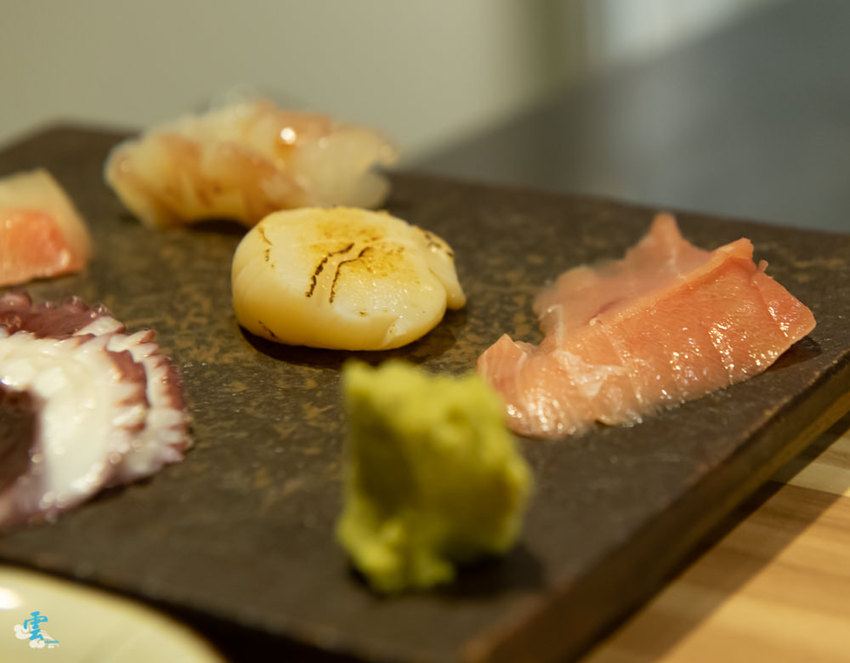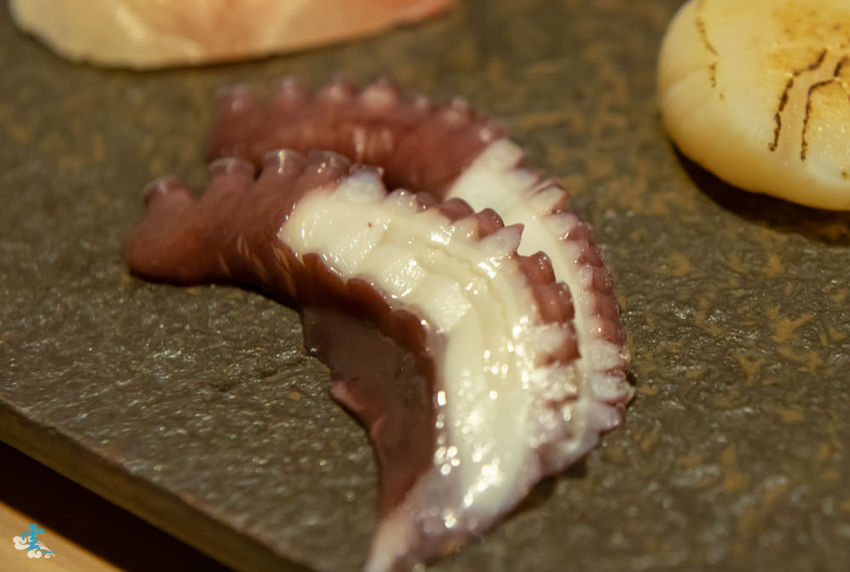 老闆一次送上水章魚、刺蝦、干貝與鮪魚腹中,熟度控制精確,讓干貝展現他獨特的柔嫩彈牙質感,肥美滑嫩讓女王印象深刻,章魚有嚼勁又Q,刺蝦肉質細嫩,感覺每個吃起來都好軟嫩的口感,黑鮪魚入口即化,鮮美甘甜在口中迴盪,有餘韻的特殊風味,香氣會一直卡在喉中,最後化為絕妙的滿足。