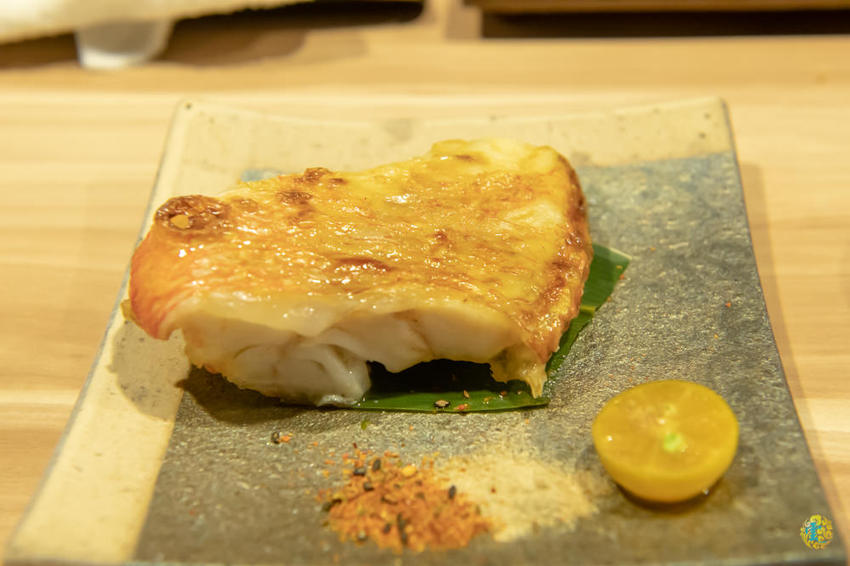 有深海紅寶石美名的喜知次,肉質肥美油脂豐富,透過老闆的巧手,將表皮處理的酥脆,一口咬下軟嫩的魚肉,鮮嫩甜美在舌尖化開,酥脆的表皮提昇了口感的層次,食材本身最初始的滋味就很棒了,老闆推薦可以將一旁的金桔放到醬油內沾著食用 ,金桔的清香與酸爽淡化了豐富油脂的油膩,帶來爽颯涼感與清香飄逸。一般人可能都會先入為主想沾點胡椒鹽,老闆也很故意或者說迎合大眾口味,居然在一旁放上胡椒鹽跟辣粉,若真的沾上胡椒鹽這搶味的調味料,可就糟蹋了這條魚啊~