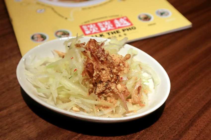 青木瓜沙拉(小),在輕脆口感的青木瓜絲上除了花生碎粒外,還有台灣人很熟悉的紅蔥頭,酸甜的調味很是清爽。