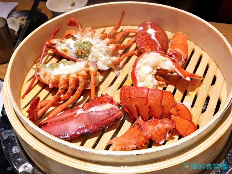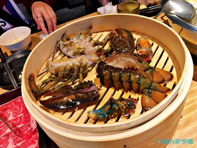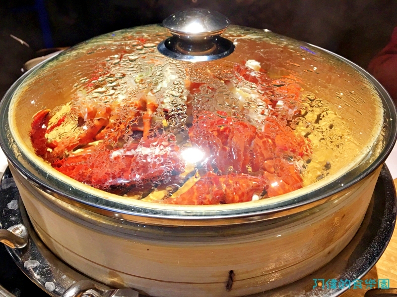 龍蝦是用蒸的,就是將蒸籠放在火鍋上,蓋上鍋蓋後,利用火鍋的蒸氣將牠蒸熟。