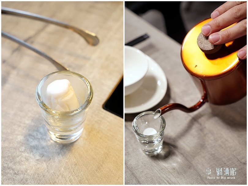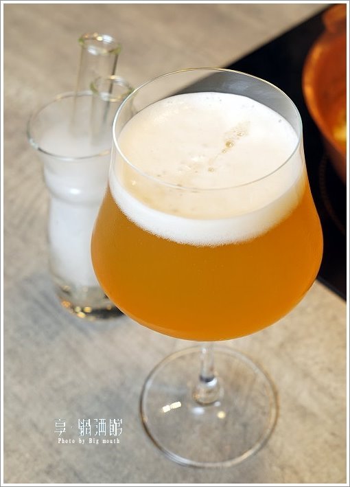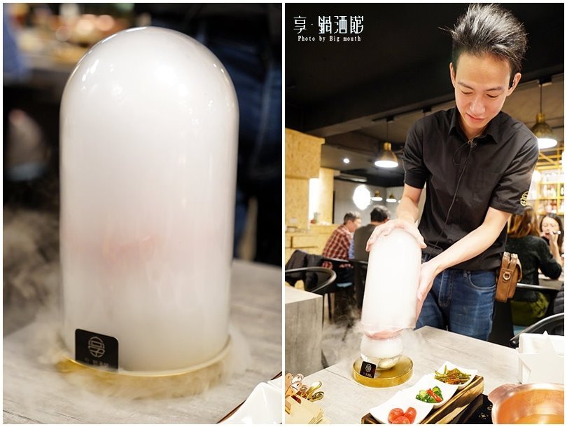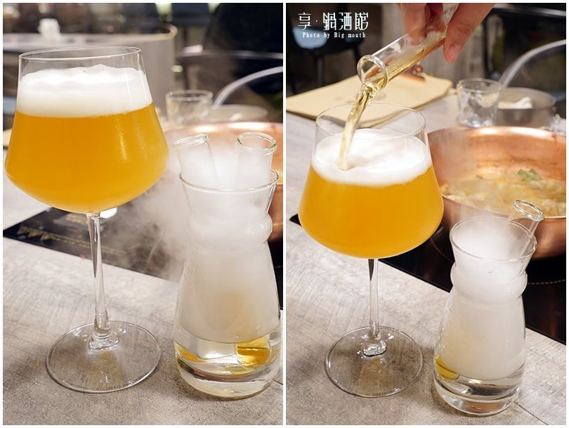▼這裡除了鍋物也有各式調酒、調飲可供點選搭配,像是這款啤酒滴管就非常特別,高腳杯裝的是來自比利時的豪格登生啤酒,一旁被煙霧所包圍的兩根試管是蘋果醋與威士忌,享用之前先將兩根試管依序倒入高腳杯即可!(未滿十八歲請勿飲酒)