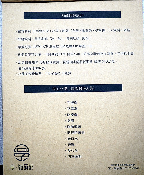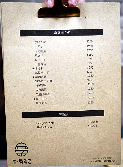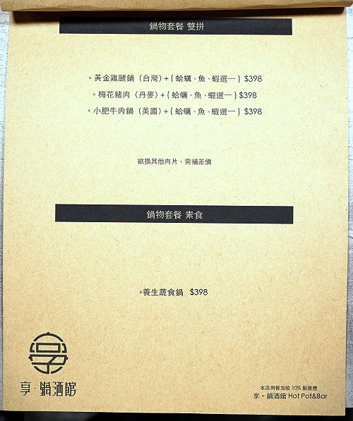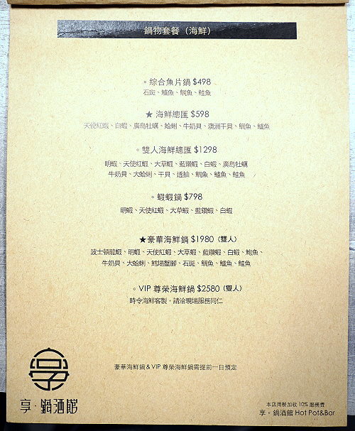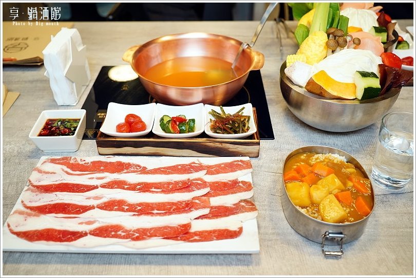 隱身在台北東區巷弄內的美食越來越多元,除了可以吃到精緻美味的鍋物之外,還可以搭配酒品一起享用!剛開幕不久的「享 鍋酒館」就是這麼一間特別的存在,不僅盤器、食材、擺盤都非常用心,從單人鍋物套餐、雙人鍋物套餐及海陸雙拼套餐通通有,最低298元起,除了主餐外,還有菜盤、小菜、附餐、飲料、甜點等,包準可以吃得滿足又飽足;像是附餐飲品還是採用星巴克咖啡豆與光泉鮮奶,檸檬紅茶則是現點現打,雖然個人鍋物套餐才298元還是可以擁有高品質的享受,真是CP值爆表!特別的是他們家的附餐都是採用便當盒盛裝,尤其是獨有的咖哩飯更是有懷舊的滋味;另外像是雙人海鮮總匯更是直接搬出一整個水族缸,看起來霸氣又豐富!此外還有煙霧迷漫、帶有仙氣的松阪豬,很多餐點上桌都會讓我們有種小驚喜的感覺~加上創意調飲更是獨特又好喝,不管是視覺、嗅覺或是味蕾都可以一次滿足,說它是浮誇系美味一點也不為過;而且好拍又好吃,可說是一間內外兼具的網美鍋物店啊!