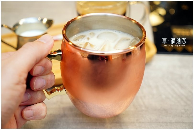 ▼另一杯則是冰奶茶,採用的是玫瑰金的銅杯,光是視覺上就讓人好喜歡!他們家的奶茶屬於茶味比較濃厚的比例,搭配鮮奶更加溫潤滑順,不會過於甜膩,算是我們近期喝到很喜愛的口味!