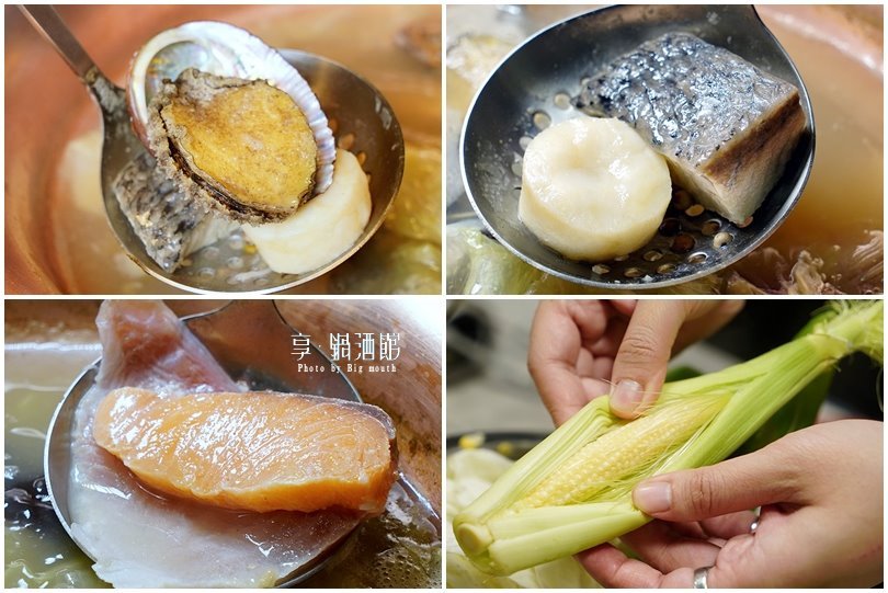 ▼另外還有鮑魚、干貝、鯛魚、鱸魚、鮭魚等海鮮,每一樣都鮮度滿滿,而且魚片都給得非常厚實大塊,吃起來很過癮!玉米筍也有先行處理過,所以一剝開就可以輕鬆下鍋,吃起來清甜爽脆,非常爽口!