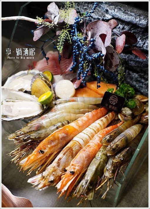 ▼裡頭除了有明蝦、天使紅蝦、大草蝦、藍鑽蝦、白蝦之外,還有廣島牡蠣、大蛤蜊、干貝、透抽、鯛魚、鱸魚、鮭魚等,種類多元又豐富!綜合海鮮拼盤搭配獨特擺飾,看起來好像藝術品般讓人捨不得吃啊!