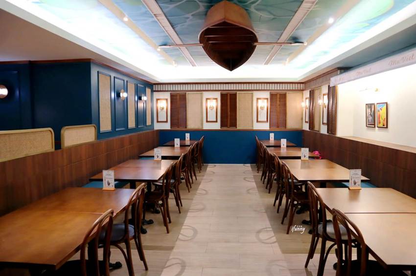 櫃檯一旁的候位區以荷花池為背景,放上了小船搭上越南特有竹笠帽及越式燈籠,整個越式風情相當濃厚。