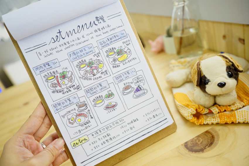 每次看到這種可愛風手繪MENU心情就特別好,本來是想吃義大利麵當午餐的,結果一到就被告知闆闆的午餐沒有供應QQ… 還好就算要我晚餐吃這種早午餐也很OK~