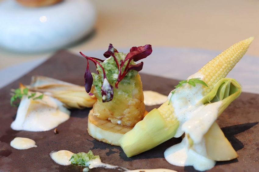 主廚利用高溫將馬頭魚鱗片煎到站起來的「立鱗燒」,入口的酥脆度加上細緻的魚肉,還有青醬的淡雅,使這馬頭魚料理十分細膩。