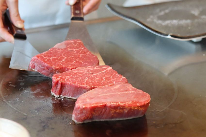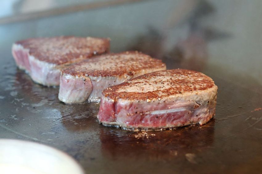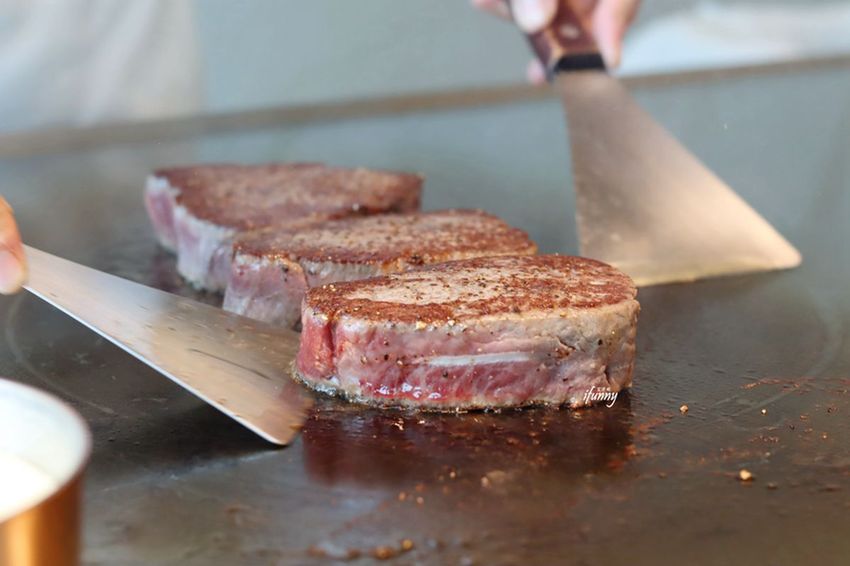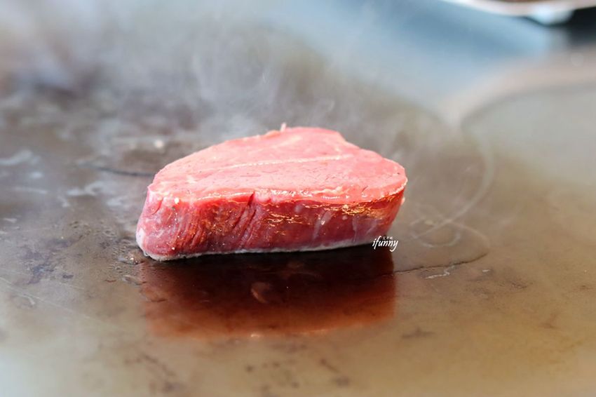 澳洲和牛菲力的部位,一放上鐵板上,冒出白煙的模樣,令人好生期待。