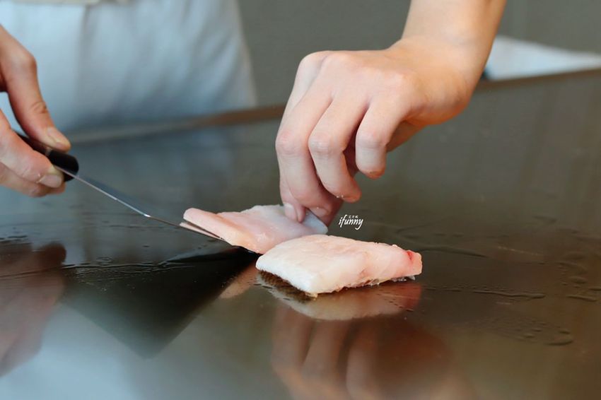 先將魚皮部份放在煎板上。邑潔師傅在料理的過程中,動作都很輕,有一種呵護食材的感覺。
