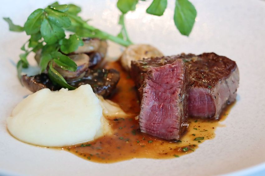 放上綿密的馬鈴薯泥,蘑菇及牛排,再淋上剛剛蒸煮的醬汁。