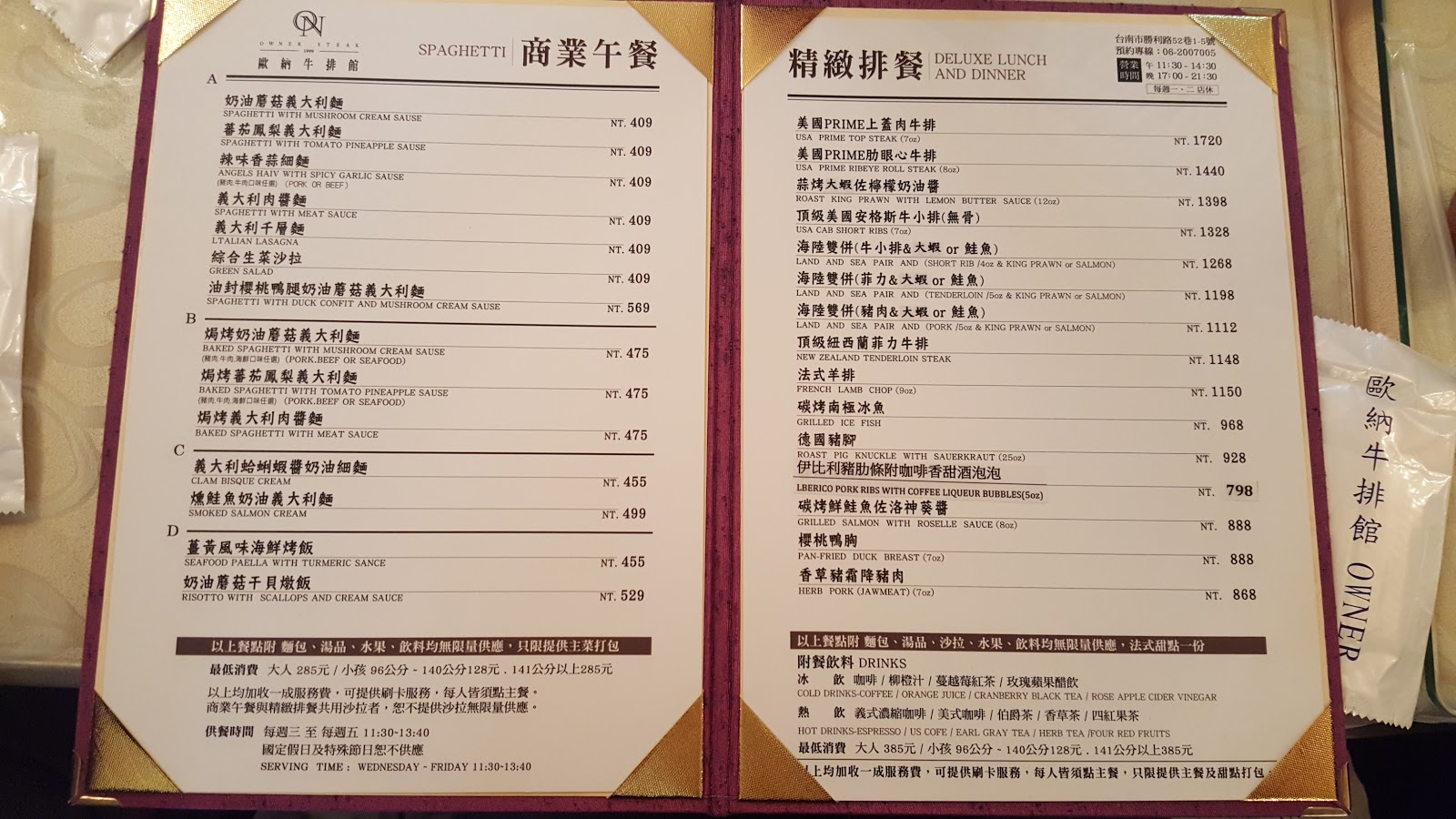 下半年度的部門聚餐選了這間歐納牛排館,開完會後搭了同事便車前往。餐廳藏身在長榮女中後面小巷,我這偽資深台南在地人竟不知這裡有間開業近20年西餐廳。