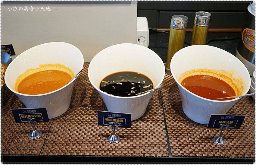 依序由左往右、沾醬為胡椒鹽、辣味沾醬、韓式醬油醬、韓式黃豆沾醬