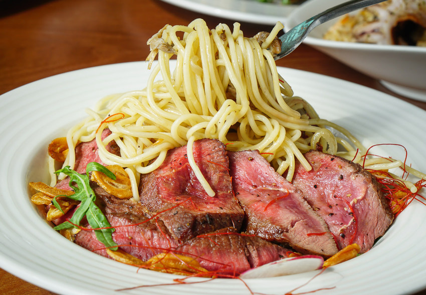 牛排肉原味,這份義大利麵做清炒,