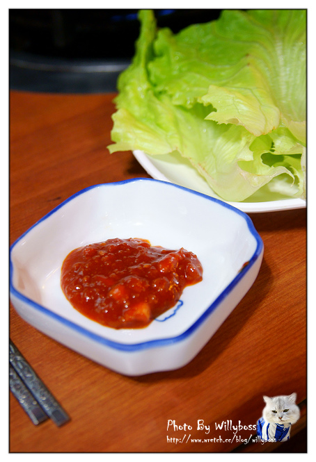 沾點醬包生菜和泡菜吃,多了蔬菜的清脆口感,加上這家的肉醃的口味不重又不會太過油膩,實在是很適合女性朋友的吃法XD。