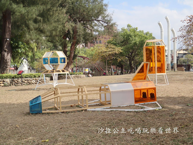 長久以來人們對於未知事物的探索是從來不曾停歇的,就像太空飛船或火箭更是我們對於廣闊無垠的宇宙探索的精神象徵,在此藝術家林建志設計了三件具有太空飛行意象的作品,搭配著明快的黃藍白配色,邀請民眾進到飛行載具裡互動,勾畫每個孩子都曾經夢過的飛翔,更提醒著我們要勇於追求夢想與理想