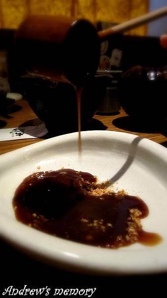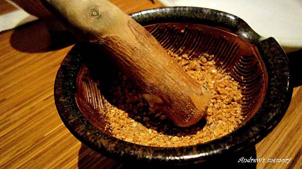 豬排醬的器皿,將芝麻磨碎後再與醬料搭配食用。