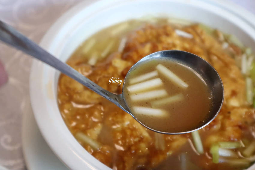 原來李師傅先燒了鍋濃湯,蛋煎好後放入湯裡,再加入韭黃、開陽、肉絲、粉絲、筍絲及冬菇。因此這還真不只是老燒蛋這麼簡單。