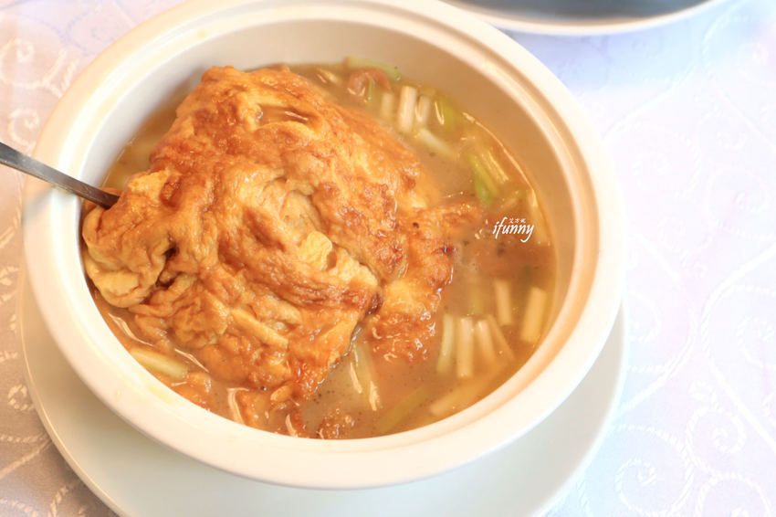煎蛋吸滿了配料煮湯的精華,蛋變得澎鬆有口感,咬下還有湯汁流出。而這湯吸收了蛋煎過的鍋氣,還有配料的香氣,滋味很是豐富,連粉絲都很好吃呢!