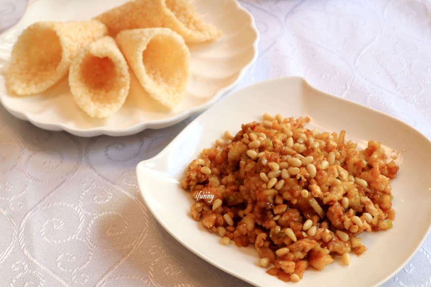 搭配的餡料是蝦仁、雞丁、筍丁、芹菜、洋蔥和松子,比起一般蝦鬆的料,味道稍重一些。