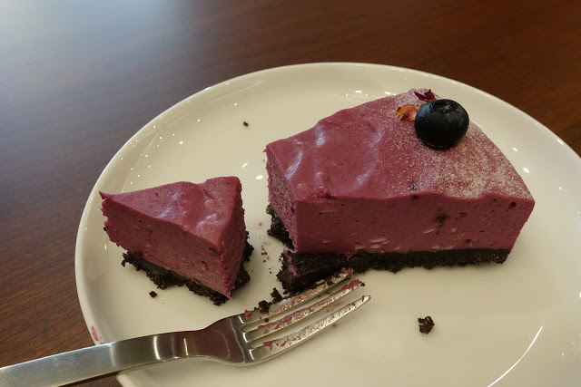 黑醋栗輕乳酪口感微酸,底層的餅皮稍甜,平衡了黑醋栗乳酪的果酸滋味,上面還綴著一顆新鮮藍莓,整體的味道真不錯!