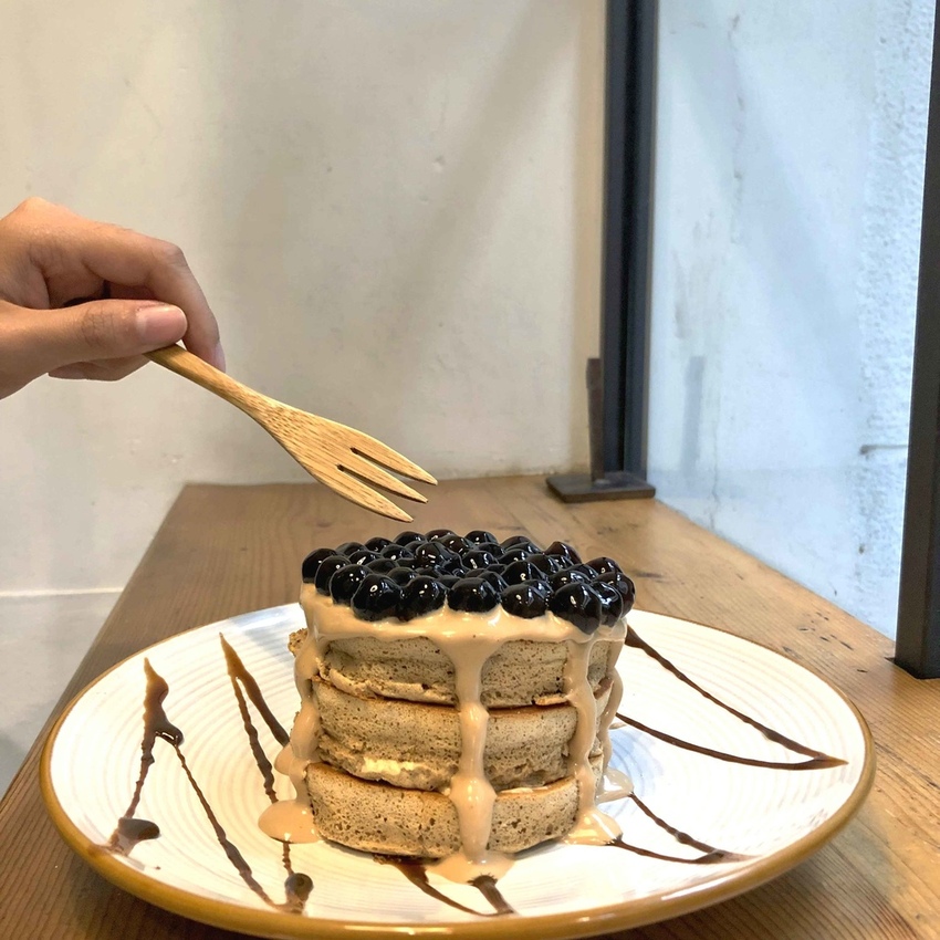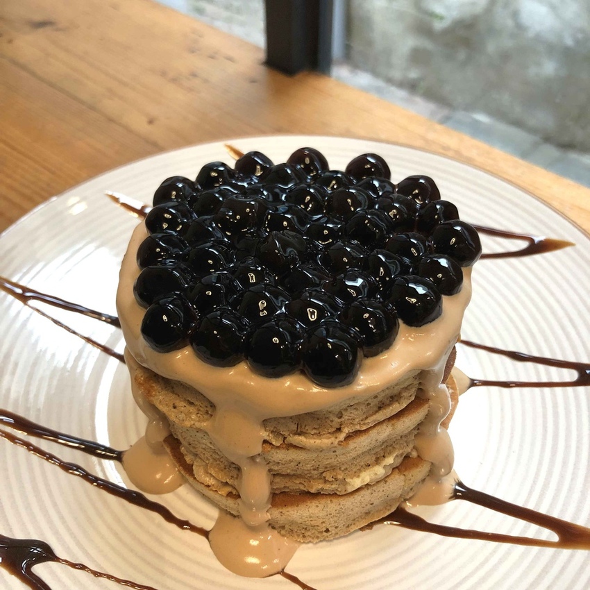 充滿茶香的鬆餅體扎實而濕潤,奶茶淋醬與Q軟的波霸的搭配甜而不膩,一下子整盤就被我和朋友掃光了!