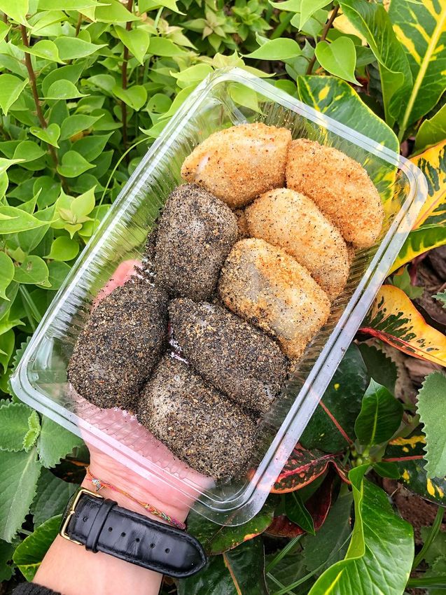 白白胖胖的麻糬真的超欠吃,內餡為綠豆泥+芝麻粉而外層的粉可選擇花生或芝麻