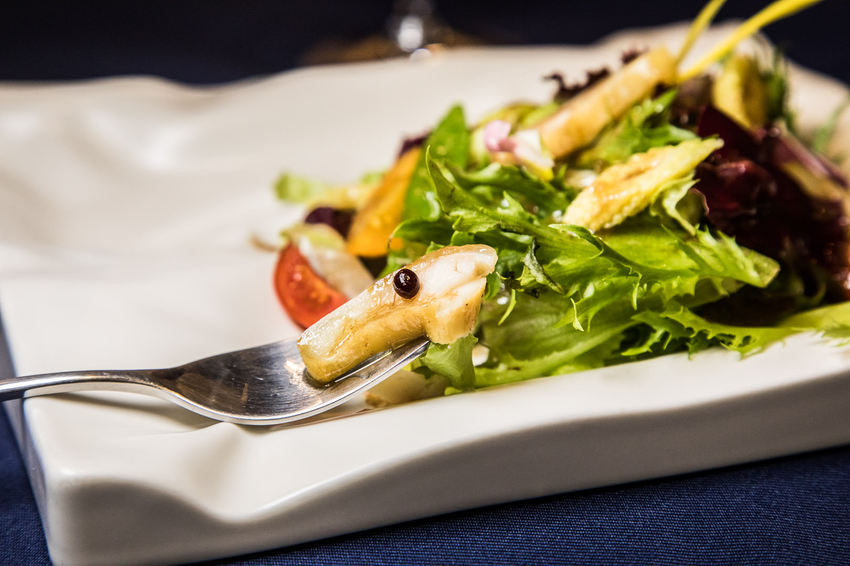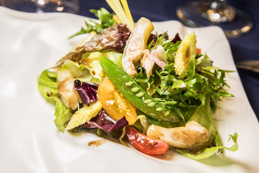 跳脫一般西式的前菜沙拉,主廚用以台灣小吃鯊魚煙的做法來料理鱘龍魚肚,並且將巴薩米克醋以分子料理的手法做成小晶球,搭配各式食蔬,宛如色彩繽紛的小花園似的