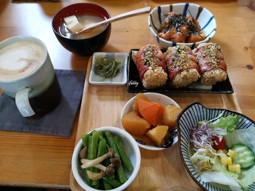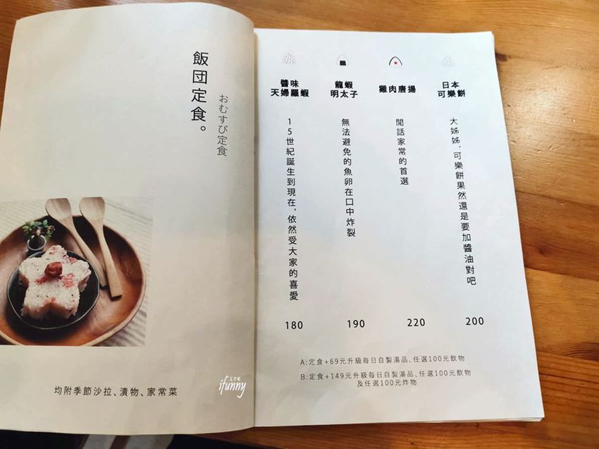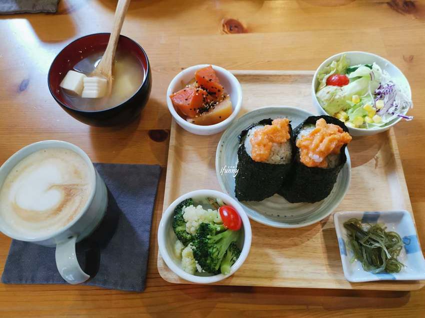 在一陣選擇困難及揪結下,我們這天最後選了以飯糰主要的餐點。