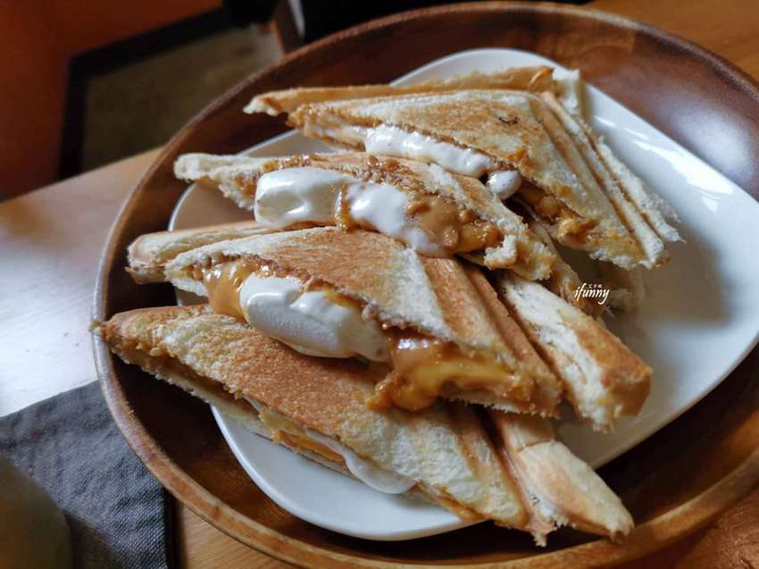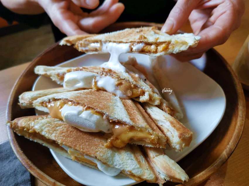 棉花糖遇熱的牽絲模樣太誘人了啦!花生醬是有顆粒的,且份量不少因此香氣十足!加了起司後就變成甜鹹的滋味,令整體吃來甜而不膩,很優秀的甜點呢!