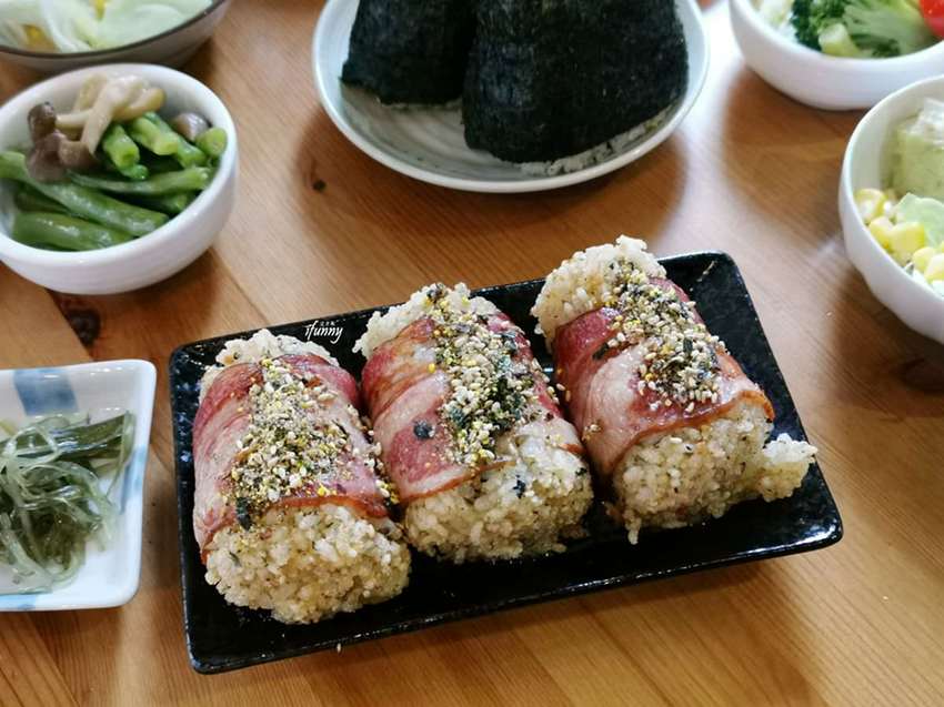 將飯糰捲成一長方型,再用整條培根捲起來,然後再經過油炸的過程,其上再飾以芝麻、海苔香鬆增加口感。